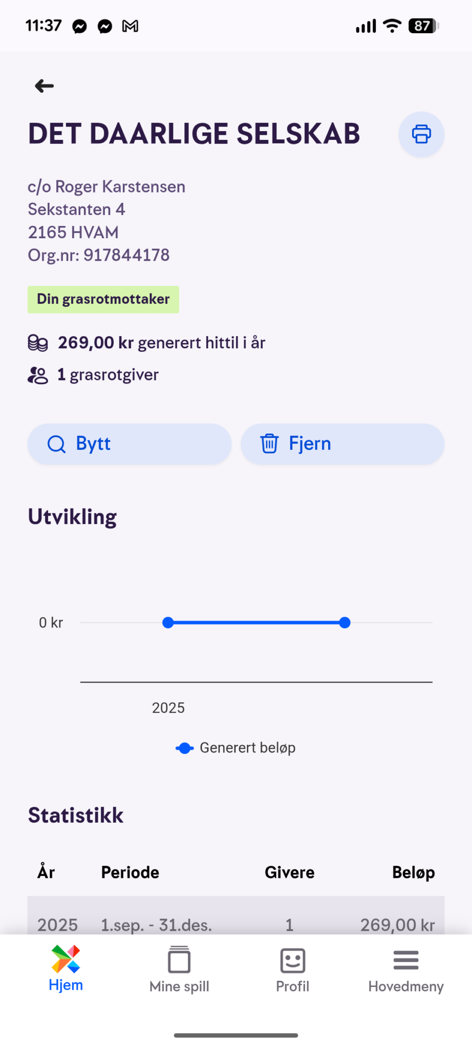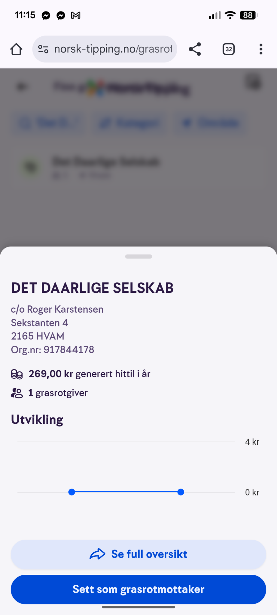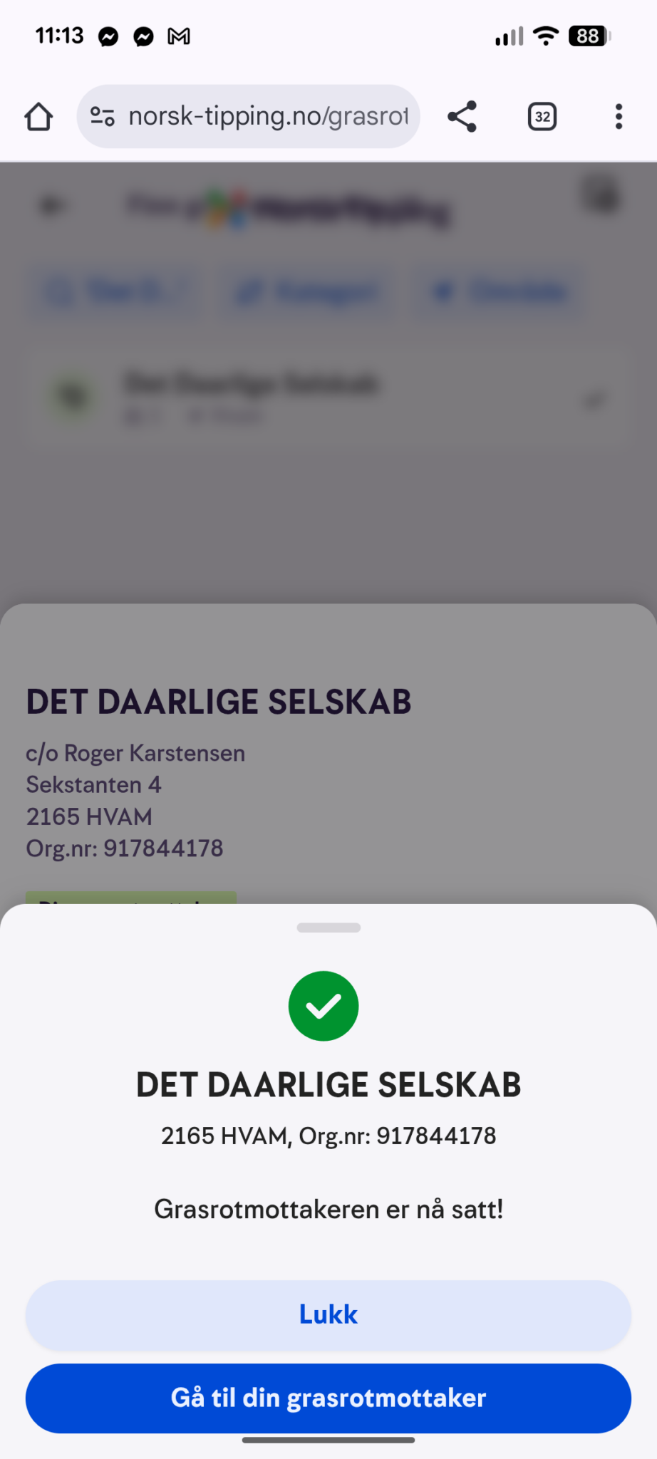 Sjekk at valget stemmer og trykk på "Sett som grasrotmottaker".