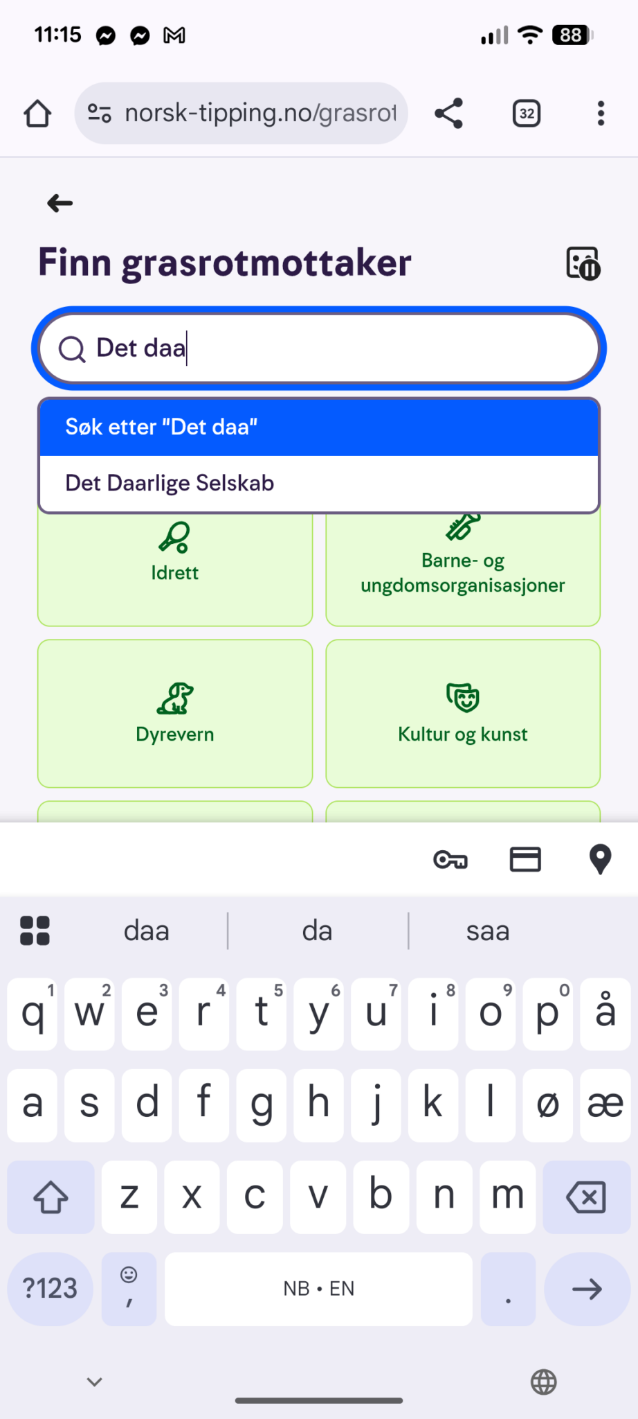 Begynn å søke ved å skrive inn "Det daa". Enn så lenge kommer det bare opp ett valg: "Det Daarlige Selskab".